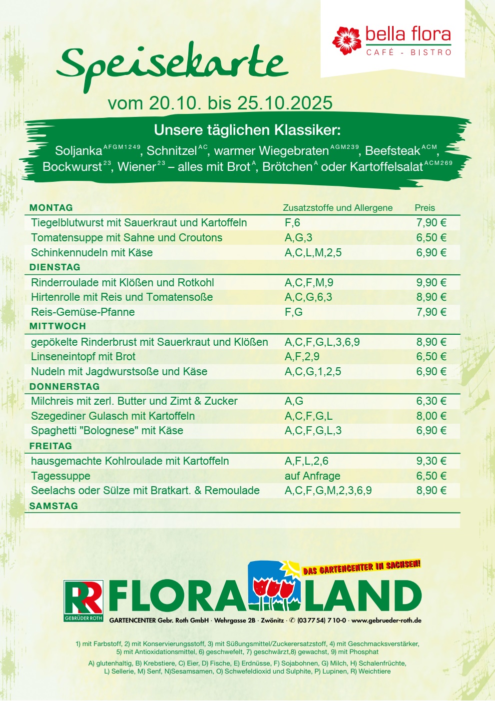 Stärkung benötigt? Oder möchten Sie sich einfach nur einen kulinarischen Leckerbissen gönnen? Dann heißen wir Sie herzlich im bella flora willkommen – dem gemütlichen Café-Bistro im Herzen unseres Fachgartencenters. Hier können Sie ganz in Ruhe ein Päuschen einlegen, während Sie unsere Küche mit leckeren Speisen, Kaffeespezialitäten, Eis und hausgemachten Kuchen verwöhnt. Wir wünschen guten Appetit!