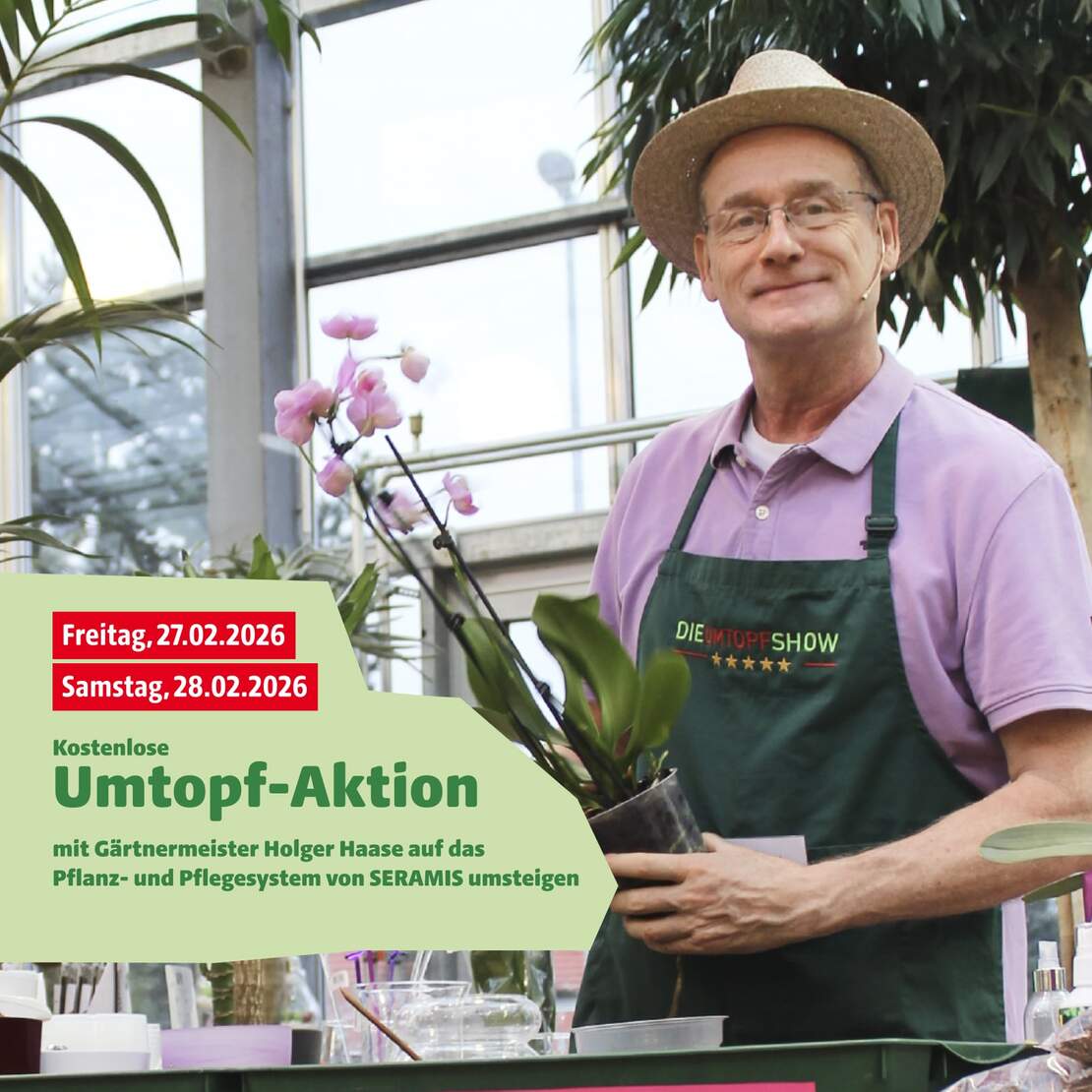 Am 27.02. von 10:00 bis 17:00 Uhr und am 28.02. von 10:00 bis 16:00 Uhr topft Gärtnermeister Holger Haase aus der Schweiz Ihre Zimmerpflanzen und Orchideen mit dem perfekten Pflanz- und Pflegesystem von SERAMIS um.
