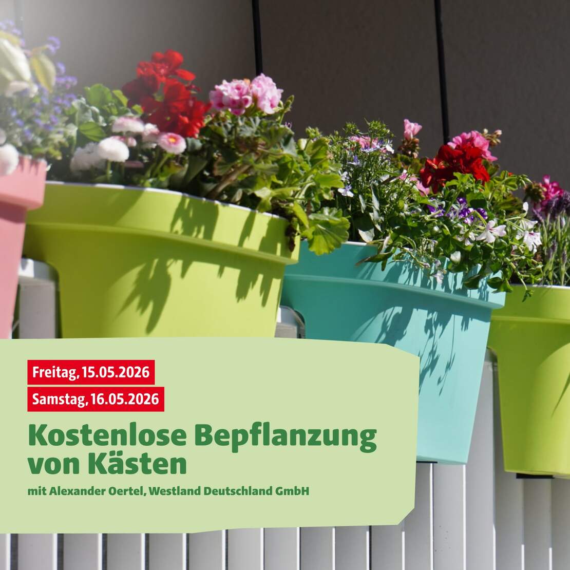 Vor Ort im Gartencenter: zusammen mit A. Oertel von Westland bepflanzen wir Ihre Balkon- und Blumenkästen kostenlos und geben praktische Tipps zu Erde, Pflanzenkombinationen und Pflege. Einfach Kasten mitbringen, inspirieren lassen und fertig bepflanzt mit nach Hause nehmen!
